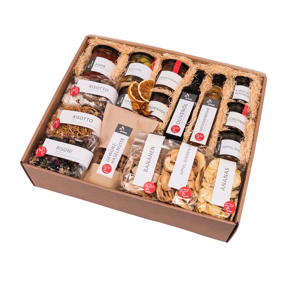 Diese exklusive Auswahl vereint liebevoll hergestellte Spezialitäten aus sorgfältiger Handarbeit: aromatische Risotto-Mischungen und Risoni con verdura, würzige Gewürz-Haselnüsse sowie feine gedörrte Früchte wie Bananen, Ananas und Apfel-Birnen-Mix.