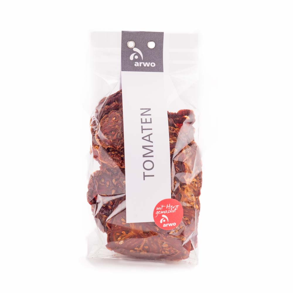 Tomaten. Genau, und das war es auch schon mit der Zutatenliste für dieses echt schweizerische Produkt. Wir trocknen die Tomaten schonend an der Luft, erhalten so ihren vorzüglich aromatischen Geschmack und machen sie auf natürliche Art und Weise haltbar – gänzlich ohne Konservierungsstoffe oder sonstige künstliche Zusatzstoffe. Von Natur aus gut.
